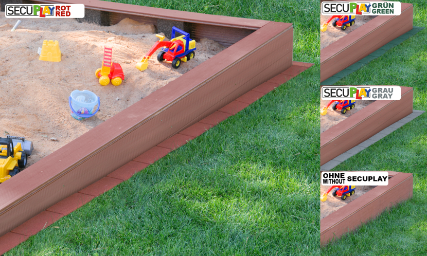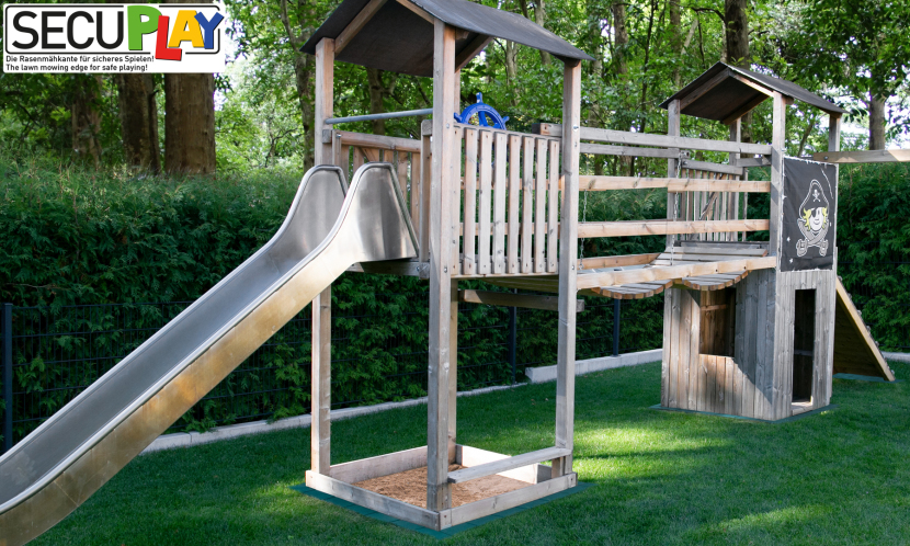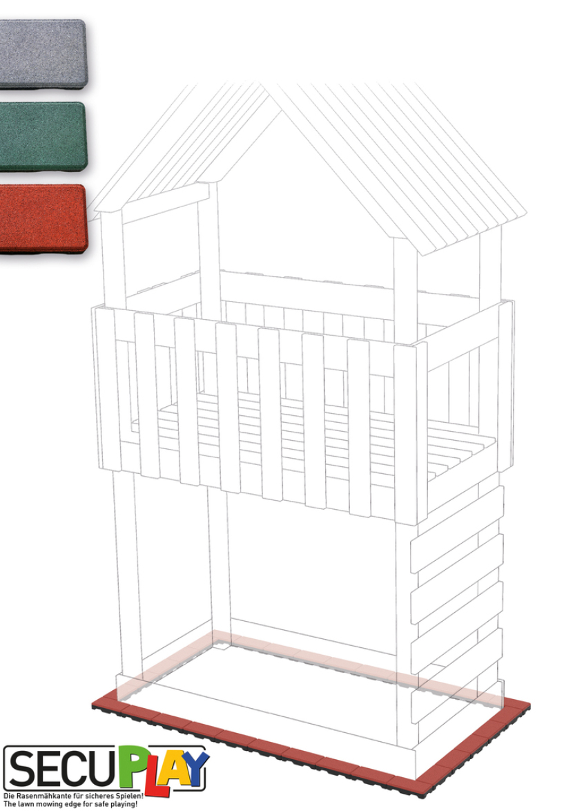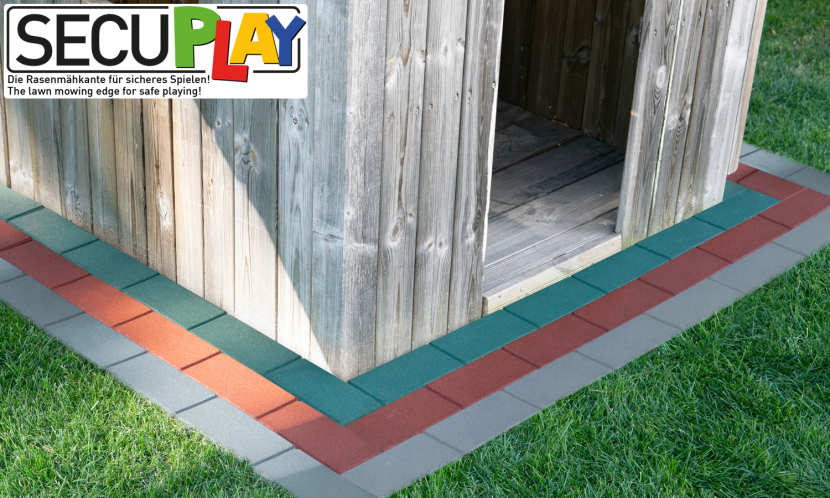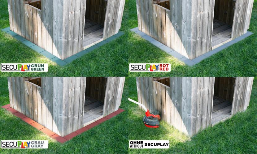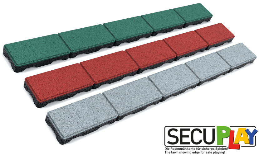 Entwickelt wurde die SECUPLAY Mähkante als Lösung einer bekannten Problematik. Stellt man z.B. einen Spielturm oder Sandkasten ohne Mähkante in den Rasen, schneiden meist weder Rasenmäher, noch Mähroboter randlos bis zum Spielobjekt. Der Rasentrimmer erscheint zwar hier als einfache Lösung, wer aber den Randbereich zum Spielgerät trimmt, beschädigt schnell das Holz oder dessen Anstrich. Als weitere einfache Lösung kämen herkömmliche Mähkanten aus Betonsteinen in Frage. Allerdings möchte kaum jemand harte Betonsteine um eine Spielanlage platzieren, um den Bereich im Garten wo Kinder spielen, sich austoben können, aber eben auch stürzen.