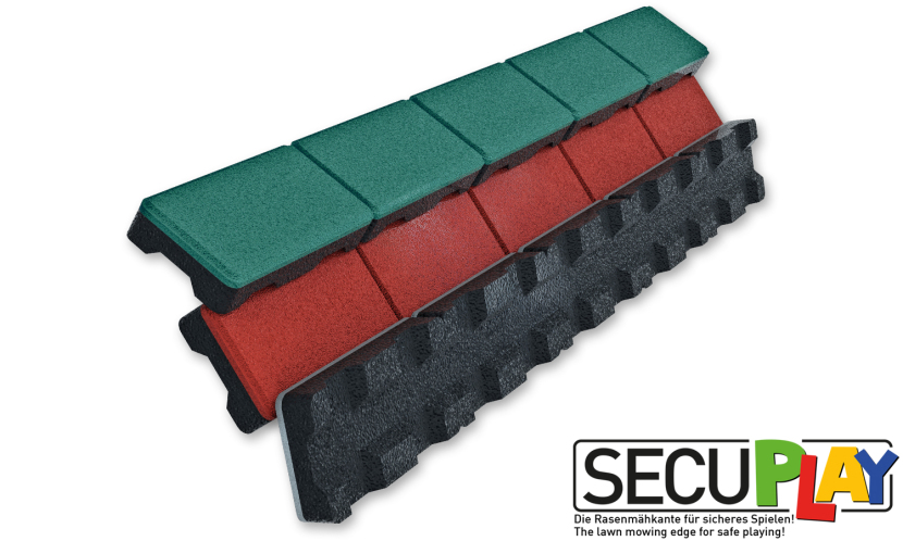 Der im Erdboden eingebettete Bereich der SECUPLAY Mähkante wurde aus einem deutlich gröberen Gummigranulat gefertigt als die obere Sichtfläche, wodurch seitlich, ein oberflächliches Anwachsen der Rasenwurzeln ebenso für dauerhaften Halt sorgt, wie zusätzlich das hohe Eigengewicht von rund 2,75kg und insbesondere die 3D-geformte Auflagefläche. Ein deutlicher Vorteil dieser betonlosen Verlegemöglichkeit ist die einfache Rückrüstbarkeit, denn bekanntermaßen werden die Kleinen ganz schnell groß. Die SECUPLAY Mähkante können Sie dann bestimmt an anderer Stelle wiederverwenden.